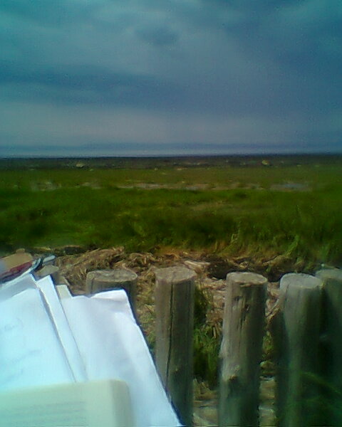 Bien assis sur le bord de la Batture, la marée est basse ce matin et devrait être haute en fin d’après-midi. Serait-ce le jusant?
