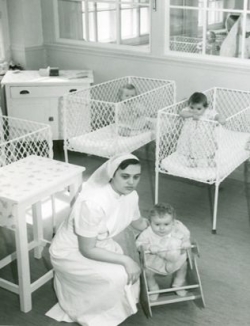 Mais j’aurai à vivre une deuxième gestation. Neuf mois passés avec les Soeurs du Bon Pasteur. Comme le montre les photos les nourrissons sont rarement hors de leurs bassinettes ou de leurs parcs à bébé. Aurais-je vécu un conditionnement répondant?**** Avoir fait de ma bassinette un lieu où je me sentais en sécurité. Quatre parois rapprochées. La génèse du Syndrome de la cellule.